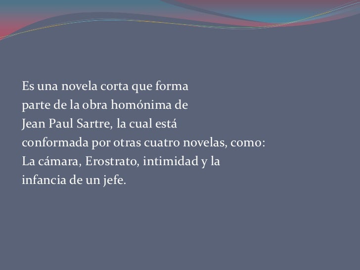 Me levanto sobresaltado; si por lo menos pudiera dejar de pensar, ya sería mejor. Los pensamientos son lo más insulso que hay. Más insulso aún que la carne. Son una cosa que se estira interminablemente, y dejan un gusto raro. Y además, dentro de los pensamientos están las palabras, las palabras inconclusas, las frases esbozadas que retornan sin interrupción: "Tengo que termi...yo ex...Muerto...M. de Roll...ha muerto...No soy...Yo ex..." Sigue, sigue, y no termina nunca. Es peor que lo otro, porque me siento responsable y cómplice. Por ejemplo, yo alimento esta especie de rumia dolorosa: existo. Yo. El cuerpo, una vez que ha empezado, vive solo. Pero soy yo quien continúa, quien desenvuelve el pensamiento. Existo. Pienso que existo. ¡Oh, que larga serpentina es esa sensación de existir! Y la desenvuelvo muy despacito...¡Si pudiera dejar de pensar! Intento, lo consigo: me parece que la cabeza se me llena de humo...y vuelve a empezar: "Humo...no pensar...no quiero pensar. No tengo que pensar que no quiero pensar. Porque es un pensamiento". ¿Entonces no se acabará nunca?